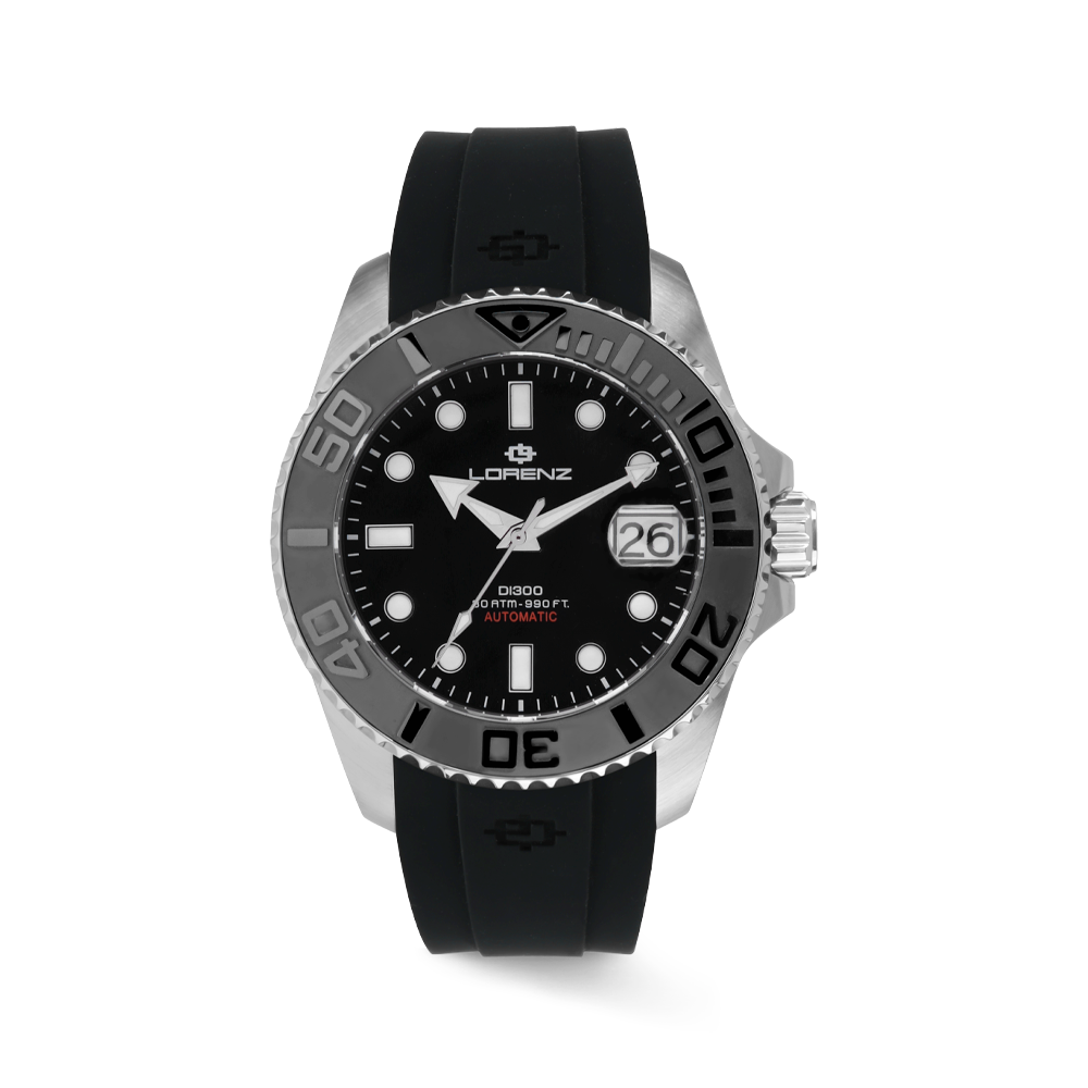 Il Doppia Iniezione è uno dei modelli di maggior successo delle collezioni Diver Lorenz. Nato per offrire un modello submarine con cinturino in gomma, questa linea è stata ulteriormente migliorata per garantire prestazioni elevate e un design raffinato. Il nuovo DI300 presenta un quadrante a due livelli e una cassa in acciaio 316L con diametro di 42 mm. L'impermeabilità è stata aumentata fino a 300 metri, rendendolo un vero orologio subacqueo professionale. La lunetta in ceramica lucida e satinata sfoggia un nuovo disegno con numeri in rilievo, mentre la corona a vite è stata rinnovata con scanalature per una presa migliore. Il fondello a vite è personalizzato con il logo DI-300 e il vetro zaffiro piatto con lente garantisce resistenza e visibilità ottimale. L'orologio è animato dal movimento automatico giapponese Seiko NH35, sinonimo di affidabilità e precisione. Il nuovo cinturino in gomma accorciabile, dotato di fibbia déployante con sicurezza, assicura comfort e praticità. Perfetto per gli appassionati di immersioni e per chi ama uno stile elegante e sportivo, il DI300 unisce performance tecniche avanzate a un’estetica di grande fascino.